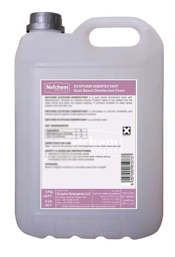 NEFCHEM ECOFOAM DISINFECTANT is a Quat based disinfectant with tinosan based anti-bacterial agent for residual activity. Product needs to be rubbed into the clean hands and does not require washing. It contains emollient to keep hands supple and soft.
