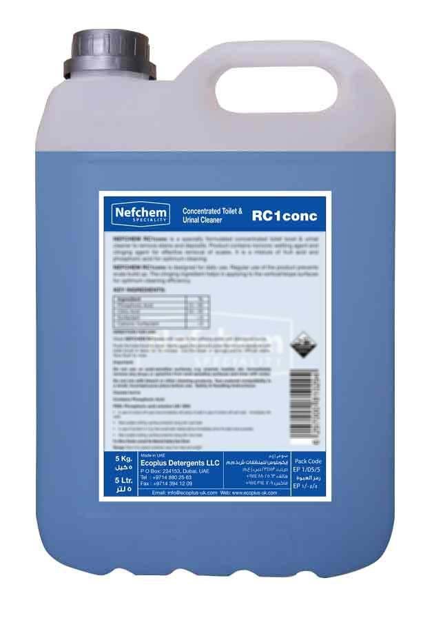 NEFCHEM RC1conc is a specially formulated concentrated toilet bowl & urinal cleaner to remove stains and deposits. The product contains nonionic wetting agent and clinging agent for effective removal of scales. It is a mixture of fruit acid and phosphoric acid for optimum cleaning.