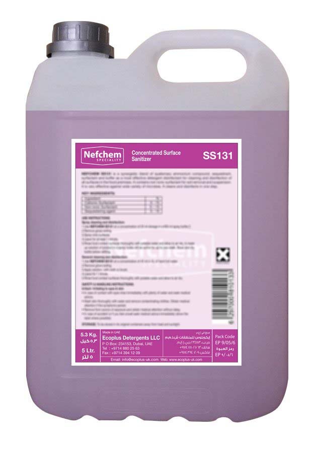 NEFCHEM SS131 is a synergistic blend of quaternary ammonium compound, sequestrant, surfactant and buffer as a most effective detergent disinfectant for cleaning and disinfection of all surfaces in the food premises. It contains non-ionic surfactant for soil removal and suspension. It is very effective against wide variety of microbes. It cleans and disinfects in one step.