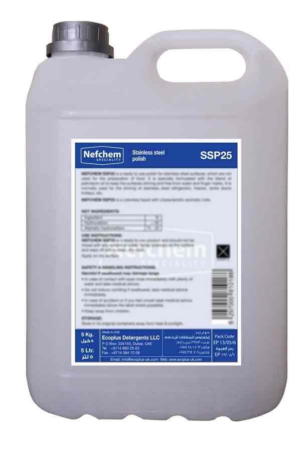 NEFCHEM SSP25 is a ready to use polish for stainless steel surfaces, which are not used for the preparation of food. It is specially formulated with the blend of petroleum oil to keep the surfaces shining and free from water and finger marks. It is normally used for the shining of stainless steel refrigerator, freezer, tanks doors trolleys, etc.