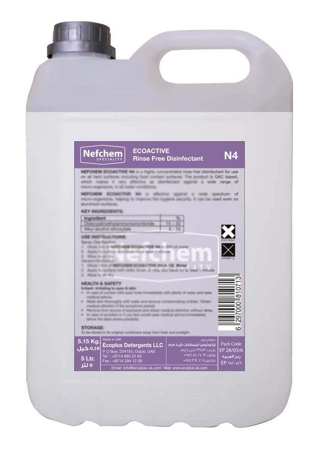 NEFCHEM ECOACTIVE N4 is a concentrated rinse -free disinfectant of quaternary ammonium compound, sequestrant, surfactant and buffer as a most effective detergent disinfectant for cleaning and disinfection of all surfaces in the food premises. It contains non-ionic surfactant for soil removal and suspension. It is very effective against wide variety of microbes. It cleans and disinfects in one step.