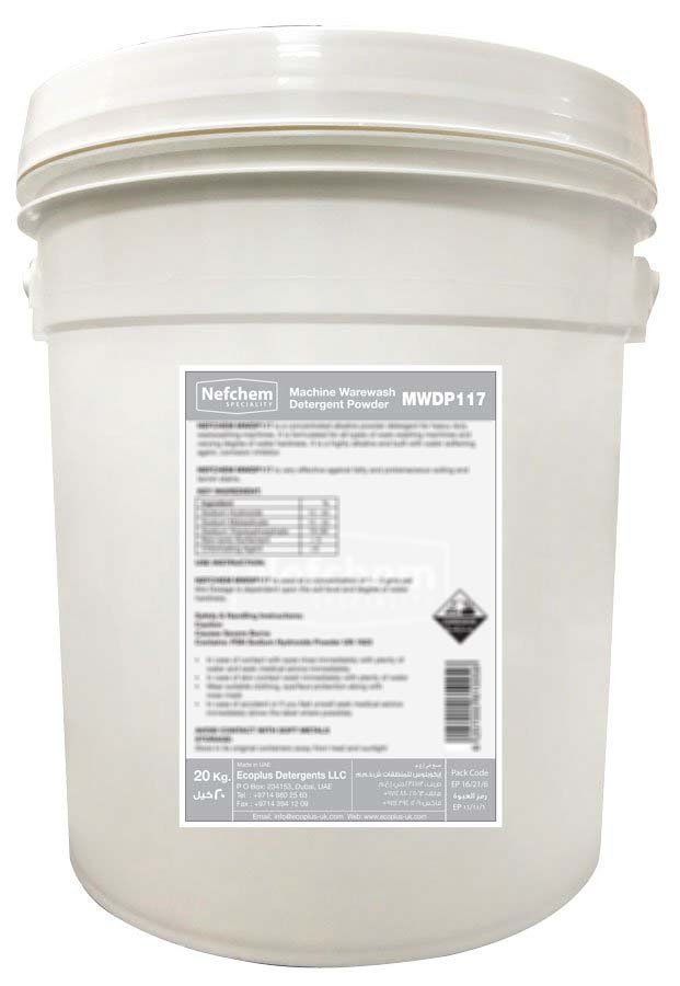 NEFCHEM MWDP117 is a concentrated alkaline powder detergent for heavy duty warewashing machines. It is formulated for all types of ware washing machines and varying degree of water hardness. It is a highly alkaline and built with water softening agent, corrosion inhibitor.