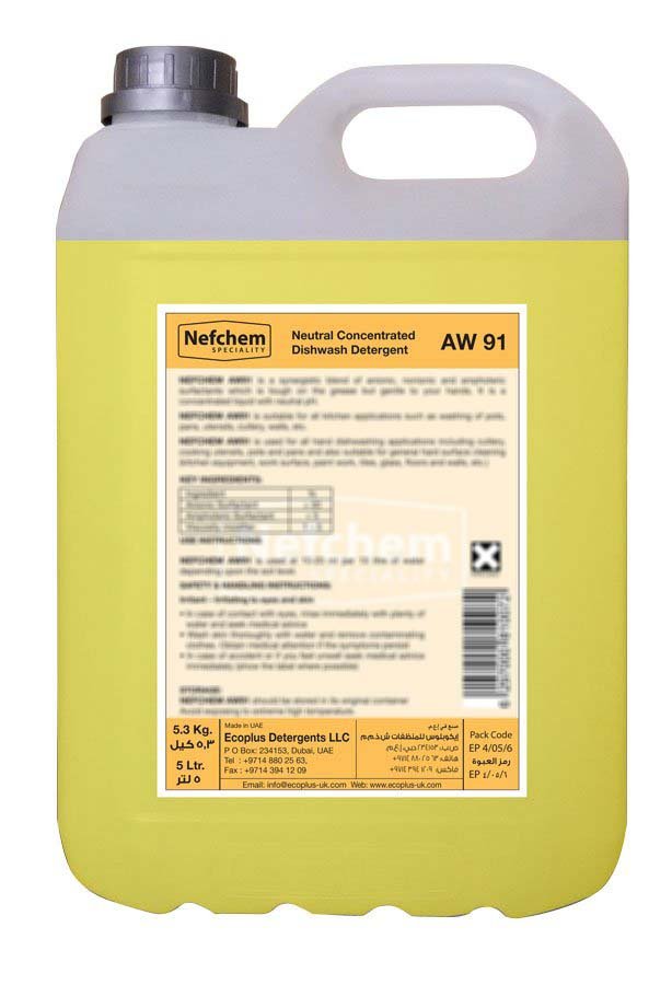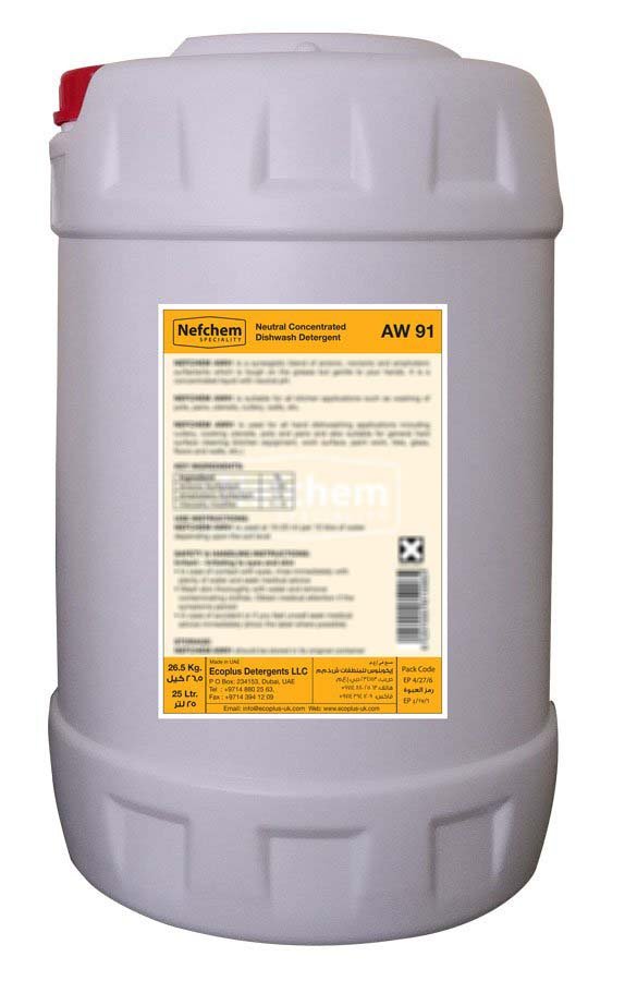 NEFCHEM AW91 is used for all hand dishwashing applications including cutlery, cooking utensils, pots and pans and also suitable for general hard surface cleaning (kitchen equipment, work surface, paint work, tiles, glass, floors and walls, etc.)
